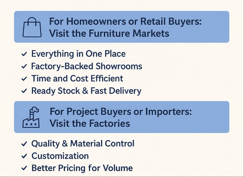 👉 In short: for smaller orders, furniture markets save you time, energy, and cost while still getting factory-level quality.